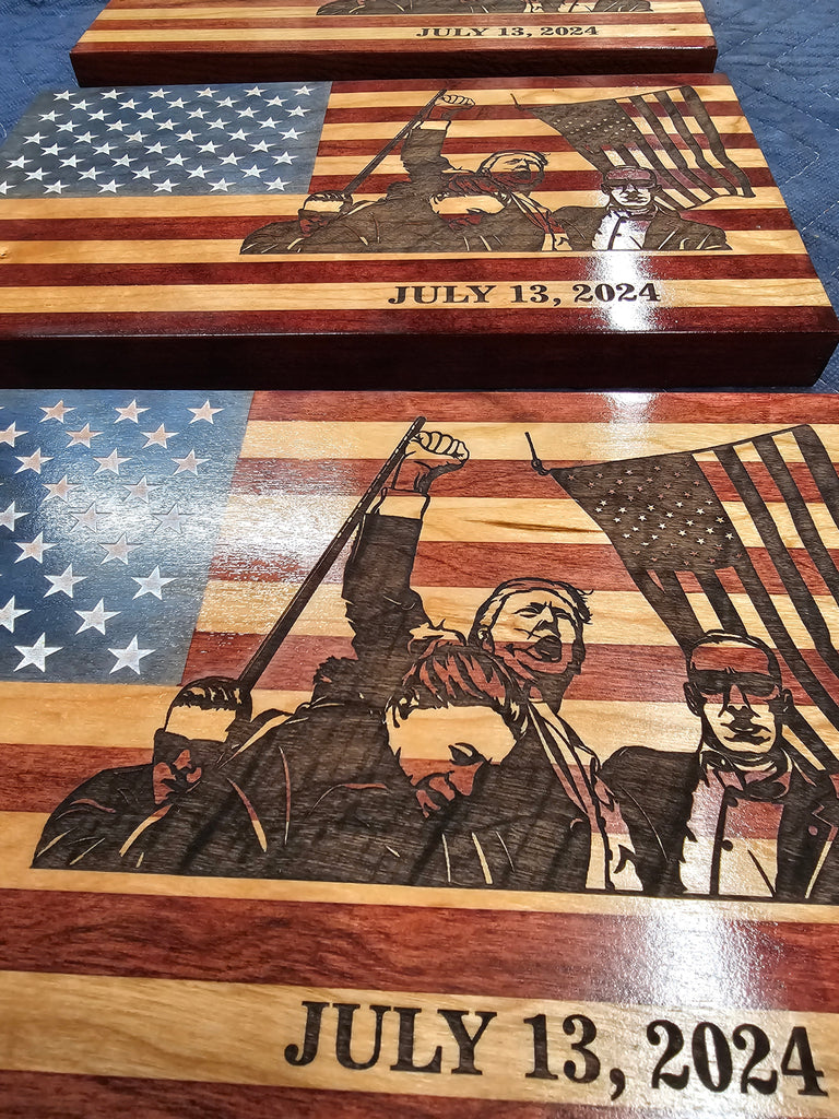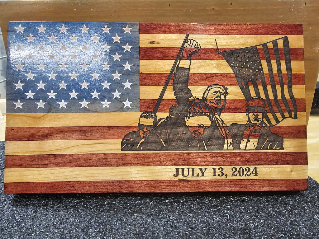 Made from solid cherry, hand stained and laser engraved. This Deaktop flag measures 6.25"×11"